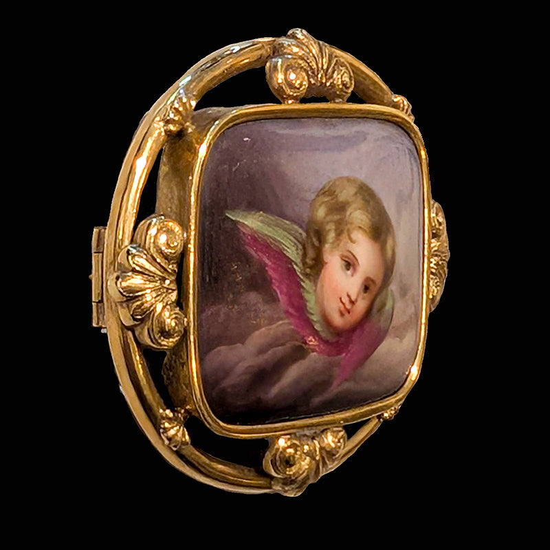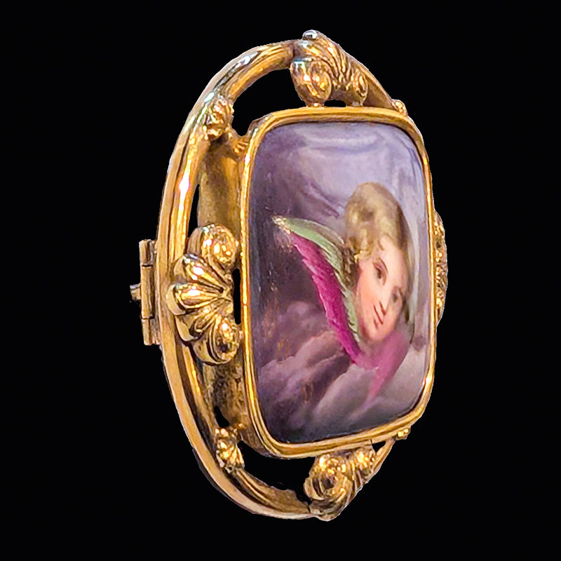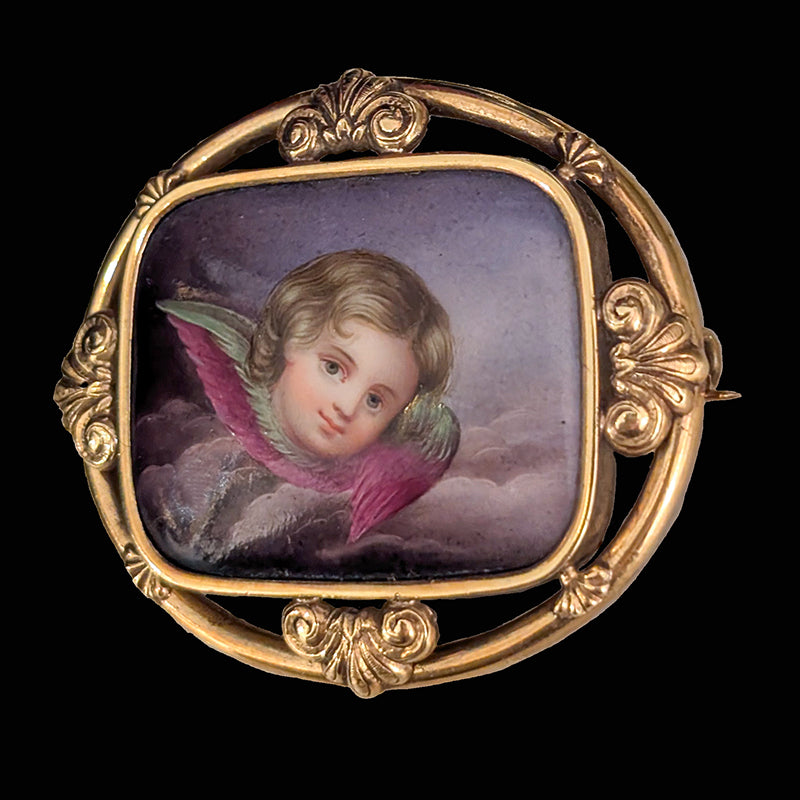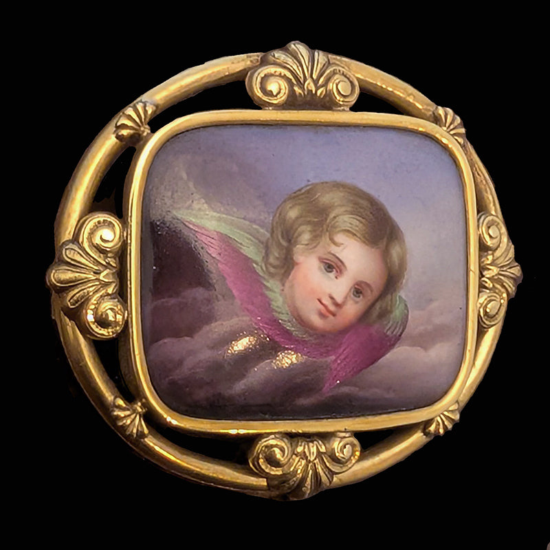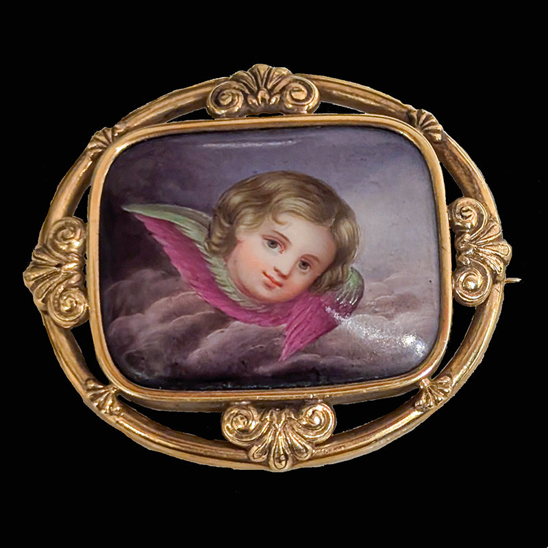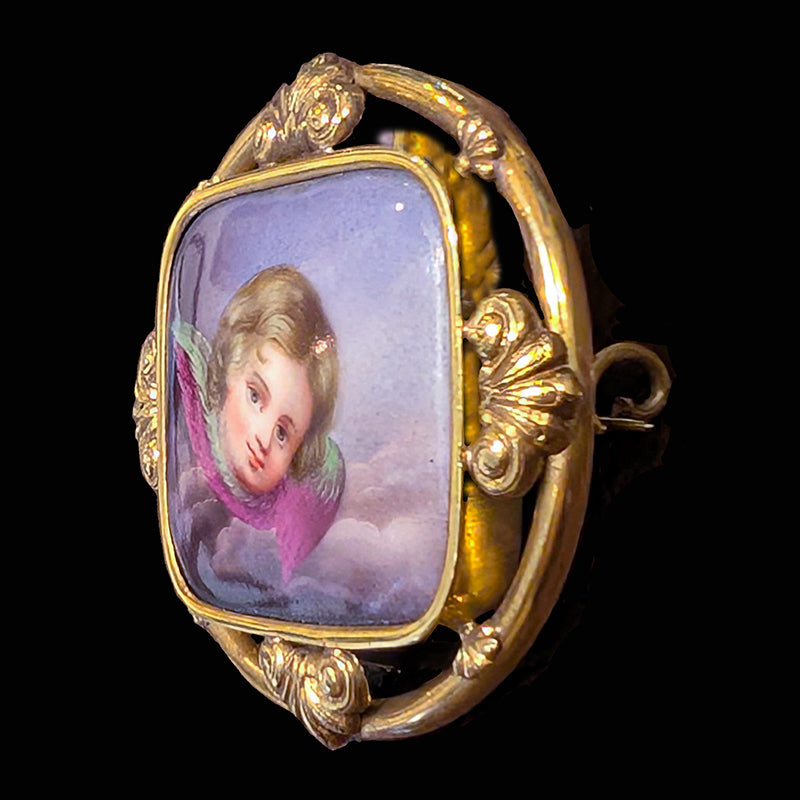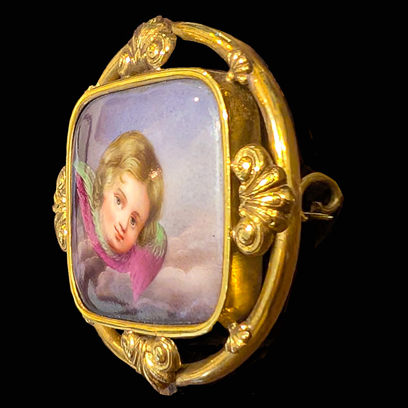 アンティークジュエリーのエナメルで絵画を描くものに比べると陶器に描かれた作品はアップに絶えない作品が多いのですが、このブローチは素晴らしいクオリティーで巻き毛に囲まれた幼児のようにふっくらとした顔の天使がどの角度から見ても美しく描かれています。